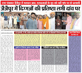 नगर पंचायत जैजैपुर में अध्यक्ष पद के लिए आज वोट डाले जायेंगे। लगभग ढाई साल के अध्यक्षीय कार्यकाल के लिए हो रहे उपचुनाव में भाजपा कांग्रेस के दिग्गज नेताओं सहित छत्तीसगढ़ जनता कांग्रेस के सुप्रीमों अजीत जोगी की प्रतिष्ठा दांव पर लगी हुई है। जैजैपुर वासियों के लिए यह पहला अवसर रहा जब नगर पंचायत के चुनाव में पूर्व मुख्यमंत्री, मंत्री सहित दर्जन भर विधायक चुनाव प्रचार को पंहुचे।